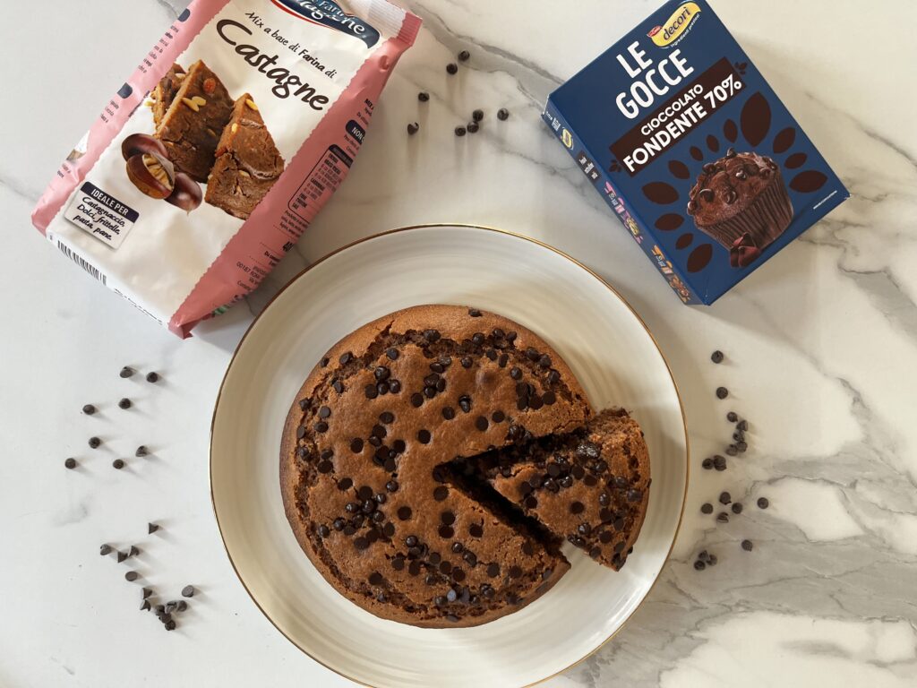 Torta con farina di castagne e gocce di cioccolato fondente, realizzata con la Farina di Castagne Le Farine Magiche e le Gocce di Cioccolato Fondente 70% Decorì.